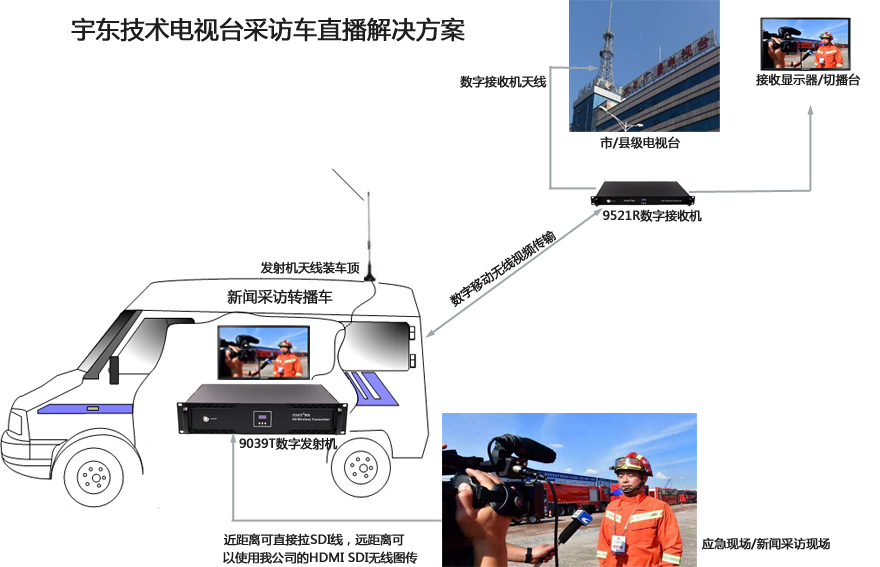 廣播 電視臺(tái)現(xiàn)場(chǎng)采訪車無線視頻信號(hào)遠(yuǎn)距離傳輸,直接在車上安裝車載無線圖傳系統(tǒng),配合車載播出系統(tǒng)切換系統(tǒng),能實(shí)時(shí)將多路攝像頭信號(hào),任意切換后通過無線發(fā)射,直接在電視臺(tái)播出機(jī)房接收到現(xiàn)場(chǎng)信號(hào),再通過光纖鏈路,傳輸?shù)诫娨暟l(fā)射塔,通過開路電視發(fā)射出去,也可以通過有線電視線路傳輸。指揮中心或者老百姓就可以通過足不出戶,看到活動(dòng)場(chǎng)面的實(shí)時(shí)畫面。
