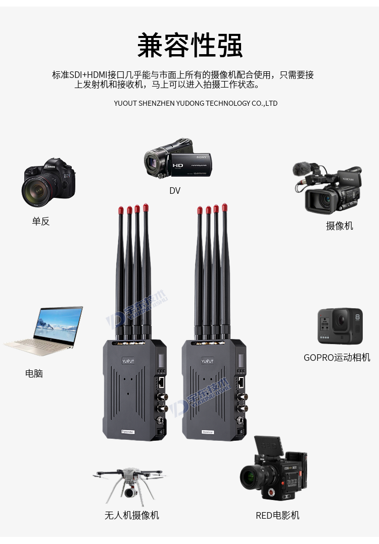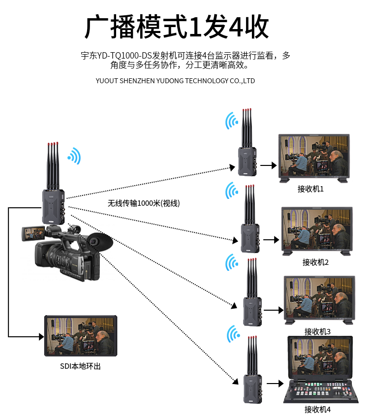 YD-TQ1000-DS是由發射端和接收端組成,支持3G/HD/SD-SDI或者HDMI 1080P全高清信號傳輸,作為圖傳時,視線無阻擋傳輸距離1000至1500米。頻段采用5.1-5.8GHz,支持用戶手動通信頻點調整,為發射端和接收端配對,還支持廣播模式,可以把多個接收端設置成跟一個發射端相同的頻點,實現一發多收。純硬件連接操作,簡單可靠。設計精巧,可以F970 、V口、 電源適配器三種供電方式,方便移動拍攝。廣泛應用于電影拍攝、應急搶險、消防、人防、武警、突發事故單兵視頻采集等場合;真正實現高清無線傳輸、移動實時傳輸、