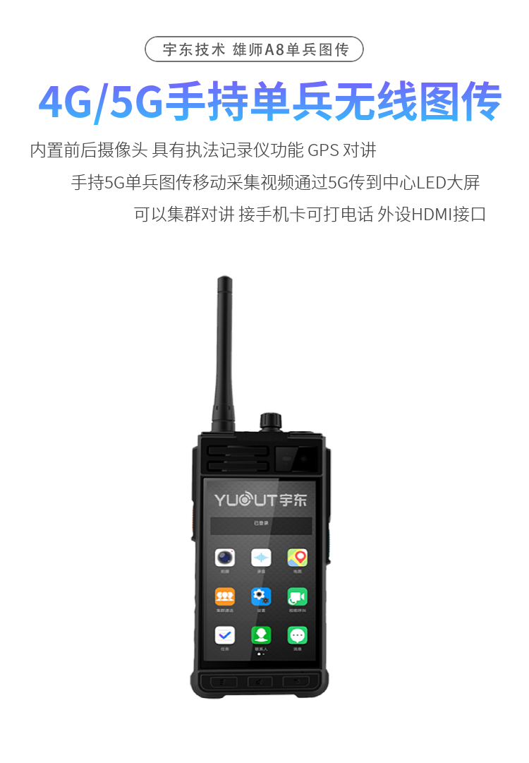 雄師A8 YD-TSP210-D-4/5G型執(zhí)行記錄儀終端是一款高性能的單人便攜型視頻產(chǎn)品,可提高前端人員執(zhí)法透明度、加強(qiáng)執(zhí)法人員與指揮中心實(shí)時(shí)溝通能力。該產(chǎn)品具有高清無線視頻圖傳、北斗/GPS定位、應(yīng)急調(diào)度、集群呼叫、移動(dòng)辦公、業(yè)務(wù)查詢等功能,可廣泛應(yīng)用于公安、交/巡警、法院、消防、武警、人防應(yīng)急、邊防、城管、保險(xiǎn)理賠、工地施工、電力搶修、鐵路搶修、公司視頻會議、電力維修、消防救援、公路管理等場合。