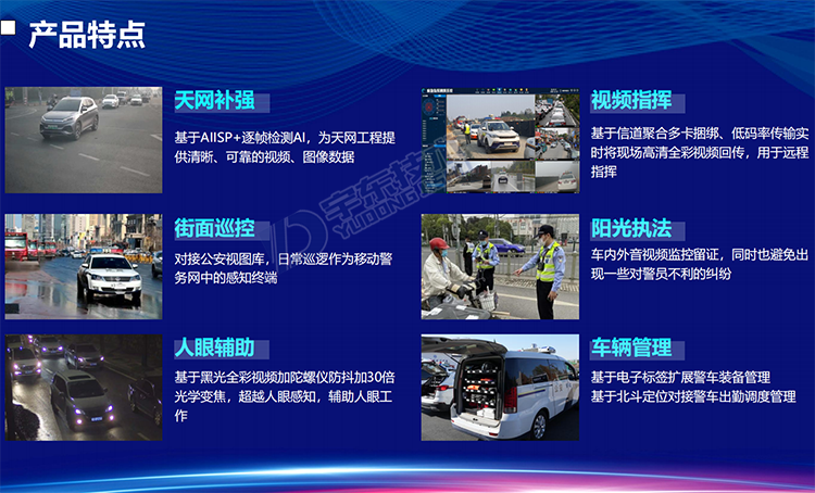 5G雷神V8 360全景視頻警燈系統是針對警用執法、刑偵和應急指揮開發的智能警用裝備。產品可部署在車輛等移動載體上,能夠對車輛周邊人員特征、車輛特征的關鍵信息進行采集。通過智能比對技術,對人員、車輛信息進行分析、甄別,實現對重點監管目標的提前預警,同時還可以通過5G/4G等網絡接入公安應急指揮調度平臺,實現前端警力的調度、指揮以及對突發事件的應急處置。產品可應用于警用大數據采集、黑名單布控、人員違法抓拍、武裝押運監管等場景。
