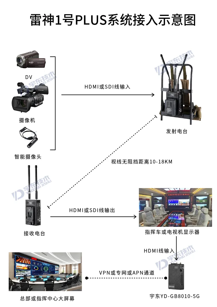 宇東技術雷神1號PLUS背負式高清無線圖傳電臺,是公司針對應急救援指揮、公安、反恐作戰、消防救援、邊防執勤、海警海關巡檢、部隊拉練演習、森林消防等,在突發重大事件,斷網斷電,通信中斷的情況下,現場工作人員通過宇東雷神1號PLUS單兵圖傳電臺,把現場采集的數據實時無線傳輸到指揮車/臨時指揮部大屏幕,讓指揮部領導對現場情況一目了然,節省了到達現場的時間,可快速做緊急指揮調度,最大限度的減少突發事件帶來的各種損失。