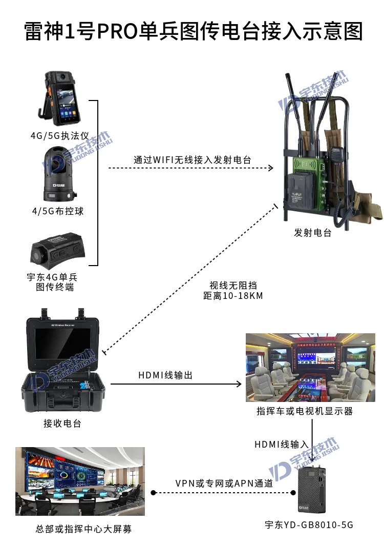 宇東技術雷神1號PRO背負式高清單兵無線圖傳電臺,是公司針對應急救援指揮、部隊拉練演習、公安、反恐作戰、消防救援、邊防執勤、海警海關巡檢、森林消防等,在突發重大事件,斷網斷電,通信中斷的情況下,現場工作人員通過宇東雷神1號PRO單兵無線圖傳電臺,可以和指揮部雙向語音通話對講,把現場采集的數據實時無線傳輸到指揮車/臨時指揮部大屏幕,讓指揮部領導對現場情況一目了然,節省了到達現場的時間,可快速做緊急指揮調度,最大限度的減少突發事件帶來的各種損失。