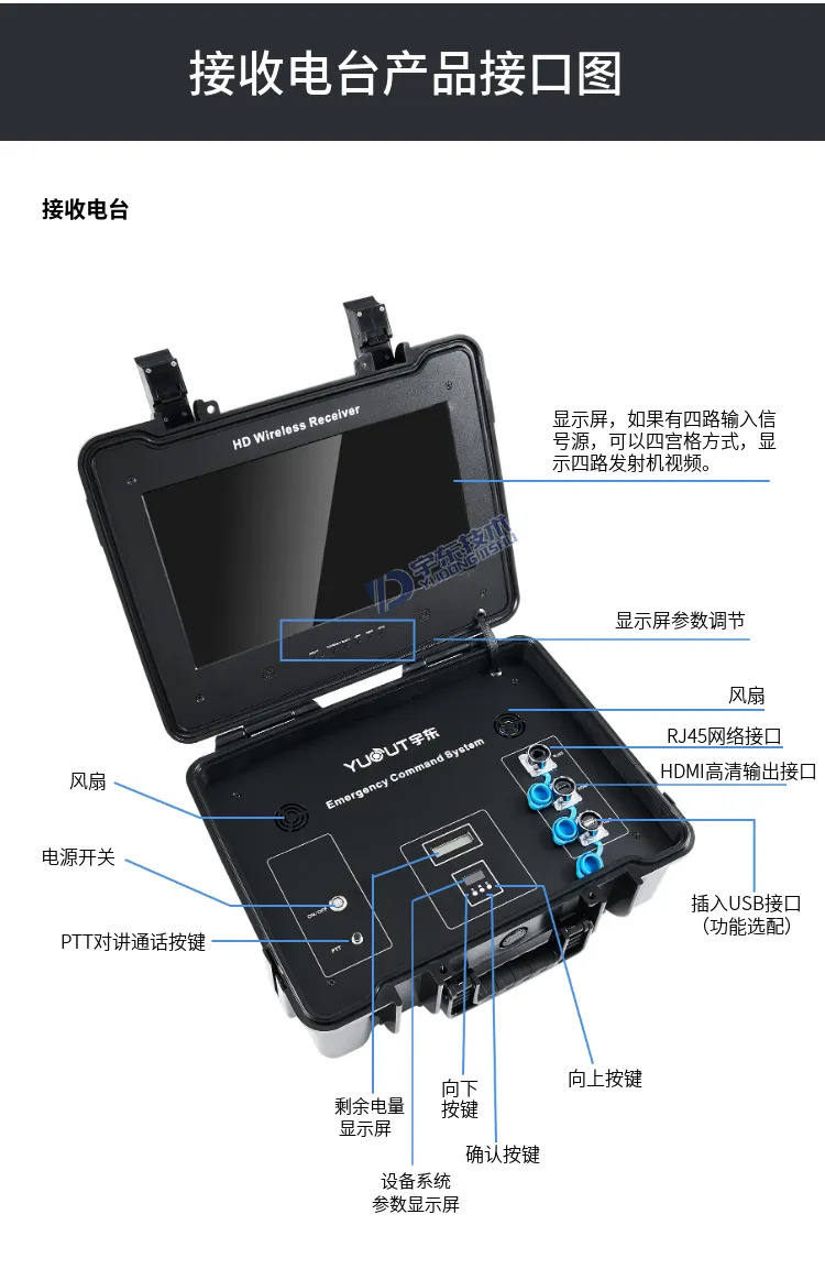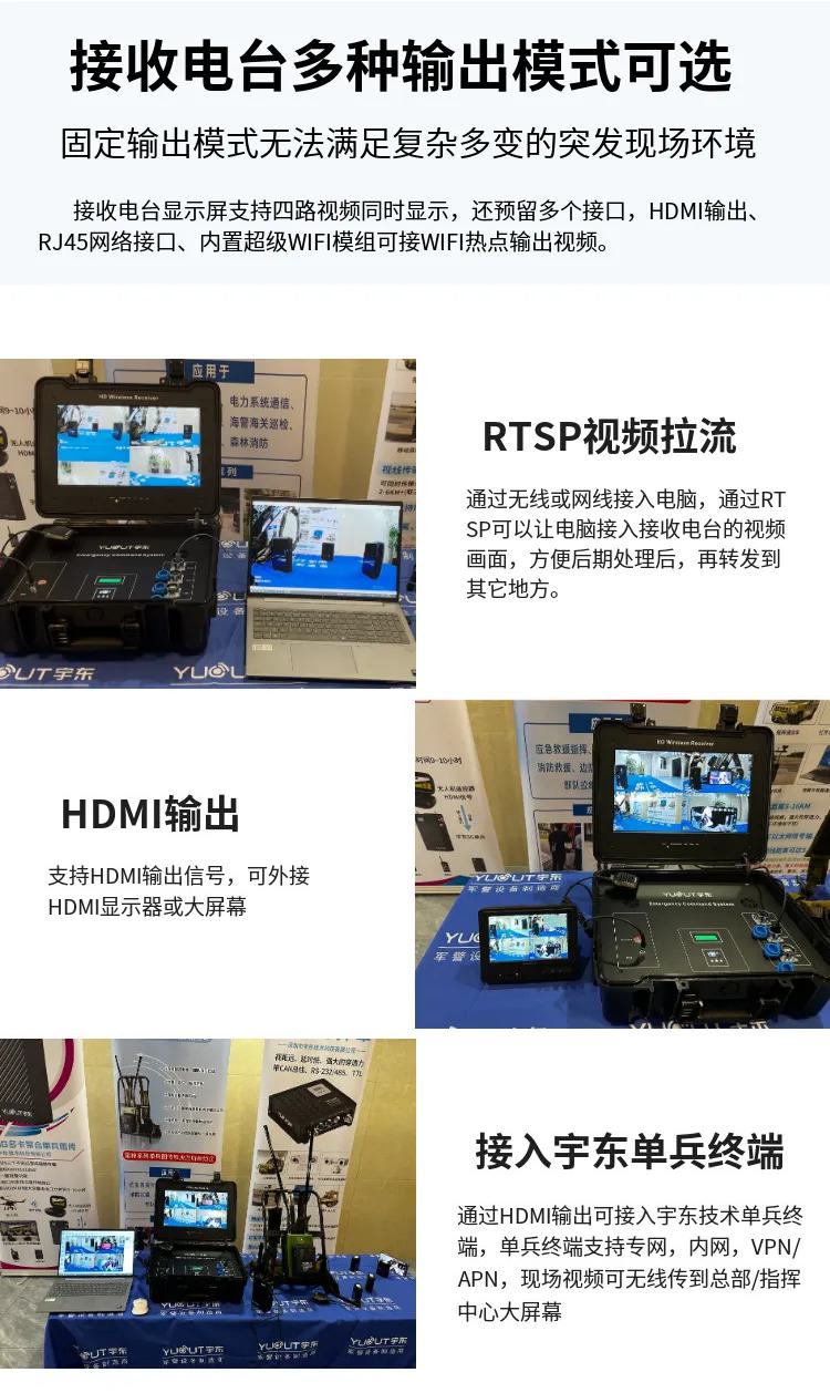16、接收電臺為指揮箱款,內置電池和顯示屏,四宮格顯示四路視頻畫面