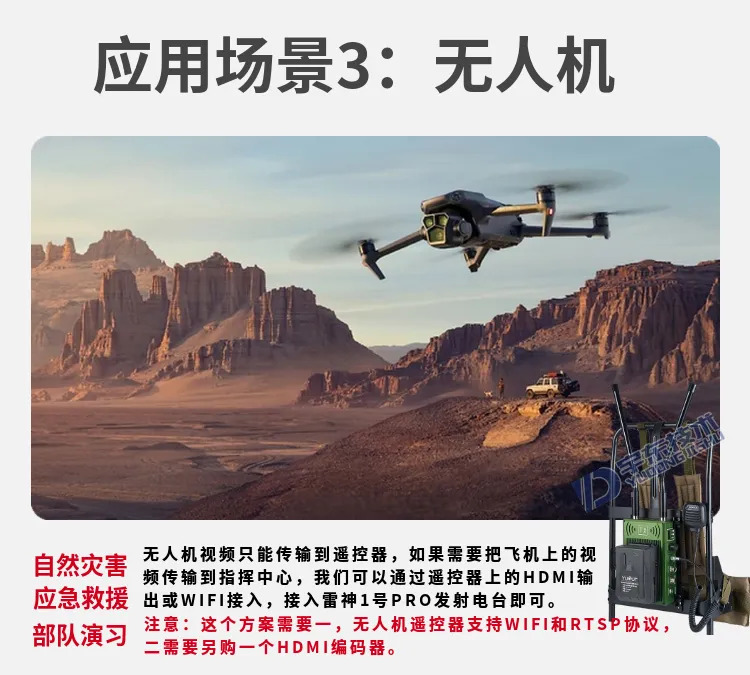 雷神1號PRO背負式高清單兵無線圖傳電臺采用工業級無線高速率數據傳輸技術,集合正交頻分復用時分多址調制及 MIMO 多進多出容量技術,完全基于 IP 互聯網協議,實現全雙向透明通道寬帶傳輸。非視距:500-1500 米;高對低地面視距或空對地視距:10-18 公里。接收電臺為指揮箱款,內置電池和顯示屏,四宮格顯示視頻畫面,并支持HDMI、RJ45網口、內置超級WIFI輸出視頻,支持RTSP協議,可以有線和無線拉流視頻源,創新性液晶一體化、擴展的 WIFI 熱點設計,便捷了用戶的使用方式,更好的用戶角度體驗。