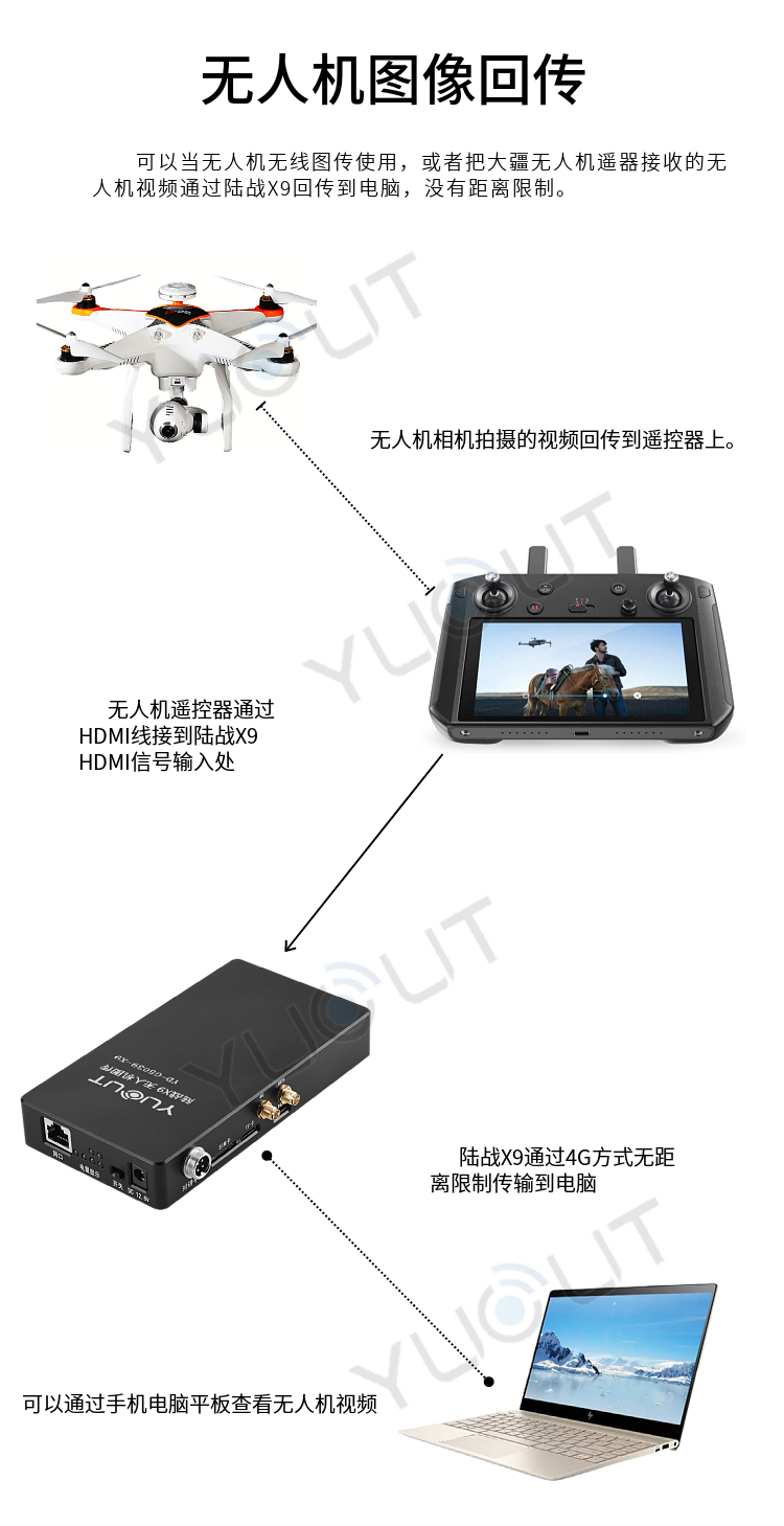 1、把無人機遙控器接收到的無人機空中畫面,通過HDMI線,接到陸戰X9 HDMI輸入接口,可以把空中無人機拍攝的視頻通過4G,沒有距離限制的傳輸到需要監看地方。